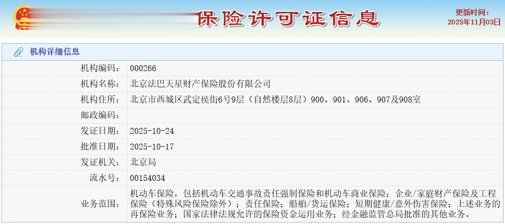 金融监管总局官网信息显示,北京法巴天星财产保险股份有限公司近日获批保险许可证,机构住所位于北京市西城区武定侯街,发证机关为金融监管总局北京局,发证日期为2025年10月24日。