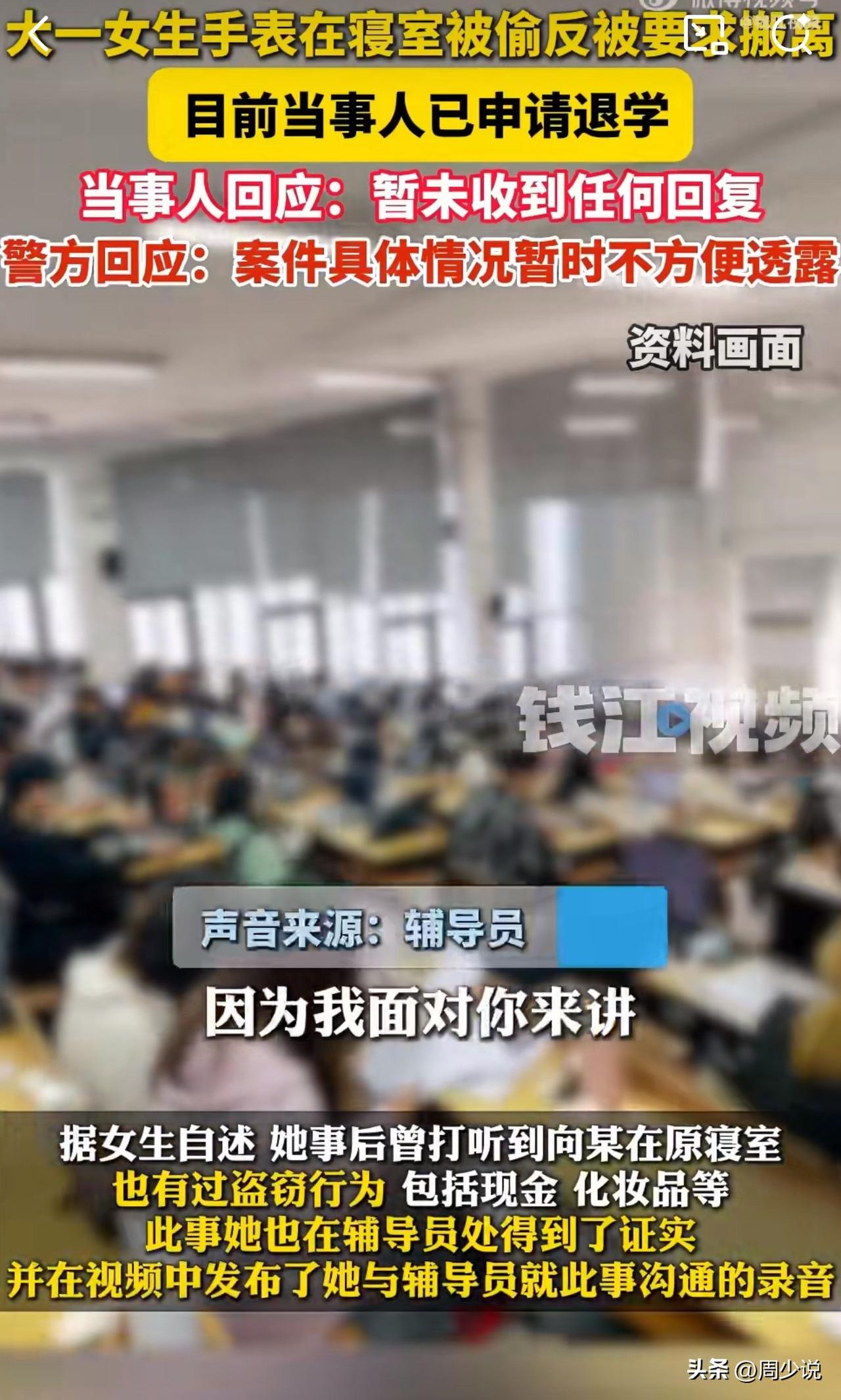 上海一高校惊现离谱事!大一女生宿舍4399元苹果手表被盗,凭定位锁定室友,辅导员却阻挠报警、反逼她搬离,最终女生无奈退学,还被扣除5千余元费用,引发全网热议! 10月9日,上海建桥学院一位大一女生的苹果手表在宿舍失窃,通过苹果定位,确认手表最后出现在室友向某(化姓)处。女生爆料,向某此前在原寝室就有盗窃现金、化妆品的前科,辅导员也证实了这一点。 可令人气愤的是,辅导员不仅多次阻挠她报警,得知报警后还电话质问。女生要求向某搬离,辅导员却反过来强制她和其他室友搬离,甚至以断电施压。 仅入学上课4天的女生,于10月13日申请退学,至今手表未找回,学校也无任何赔偿,退学还被扣除各项费用5330.6元。 目前警方仍在调查,女生投诉后仅收到学校办公室的问询,暂无实质性回复,学校称将依法依规处理。 此事引发众多网友热议,有网友说:“辅导员这操作太离谱!明显偏袒有盗窃前科的学生,寒了受害者的心!” 还有网友更是表示:“上课4天扣5千多,这钱扣得莫名其妙,学校必须给个说法!” 周少认为,学生财物被盗本应被重视,辅导员却本末倒置,阻挠维权、强制搬离,真是寒了学生和家长的心,属实让人不敢相信。 高校不仅是教书之地,更应守护学生权益、坚守公平底线。4天课程扣除5千余元,合理性存疑,希望学校能正视问题,给当事人一个公正答复,也给公众一个透明交代。 对于这位大一女生手表寝室被偷反被要求搬离,大家怎么看呢?#长沙新朋友# #寻美三湘#
