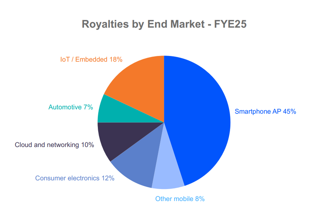本季度Royalty收入受数据中心、手机、汽车和IoT等所有主要市场增长的推动,最大的增长贡献是手机(得益于更高的单芯片Royalty费率)和数据中心(继续看到来自超大规模云服务商定制芯片的市场份额增长);数据中心NeoverseRoyalty收入同比增长超过一倍,汽车和物联网业务均继续同比增长;FY25Cloudandnetworking占Royalty收入比例为10%,当分析师预计FY26会提升到15%-20%时,管理层表示认同,年底会更新该数字;