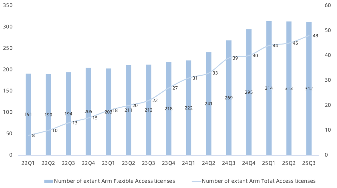 本季度签下4个ArmTotalAccess(ATA)合约,目前累计48个合约(ATA年费每年会涨价7%,三年一续);ArmFlexibleAccess(AFA)目前已有312个客户,环比再流失1个。