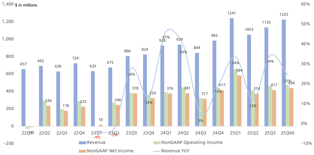 预计下季度营收12.25亿美元,同比增长25%;NonGAAP净利润4.38亿,同比增长5%;