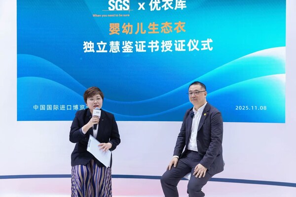 上海2025年11月8日--2025年11月8日,第八届中国国际进口博览会(CIIE)期间,SGS携手优衣库于上海国家会展中心7.2馆A2-02展位举办独立慧鉴产品认证授证仪式。SGS中国区可持续业务创新委员会总监、时尚与服饰科技服务全球技术副总监王安博士向迅销(中国)商贸有限公司企业团购事业部经理冯尚红女士颁发婴幼儿生态衣产品独立慧鉴认证证书——优衣库自2021年摘得国内首张该认证以来,已连续五年获此权威认可。