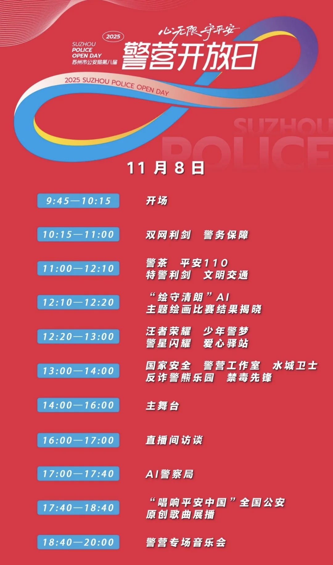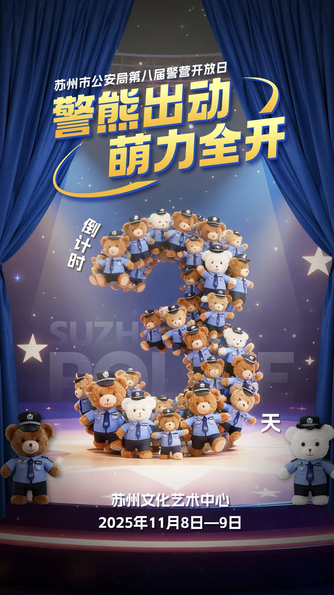 11月8日-9日 每天10:00-16:00 就在苏州文化艺术中心!!! 苏州市公安局第八届警营开放日又来啦! 1个主舞台、17个主题展区...... 还有交警铁骑帅气表演、呆萌警犬在线“营业”、反诈熊出没萌趣突袭、特警魔鬼营硬核开练、禁毒 CS 沉浸式对战...... - ‼️地铁🚇文化博览中心站 -