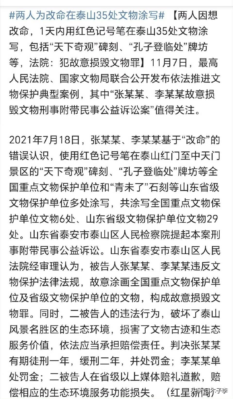 两人因想改命,1天内用红色记号笔在泰山35处文物涂写,包括“天下奇观”碑刻、“孔子登临处”牌坊等,法院:犯故意损毁文物罪】11月7日,最高人民法院、国家文物局联合公开发布依法推进文物保护典型案例。 [允悲]一波操作猛如虎,给自己改进去了泰山纪念碑 山东文物标识