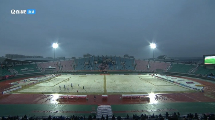 本场比赛,延边龙鼎主场积雪严重,草坪都被染成了白色。