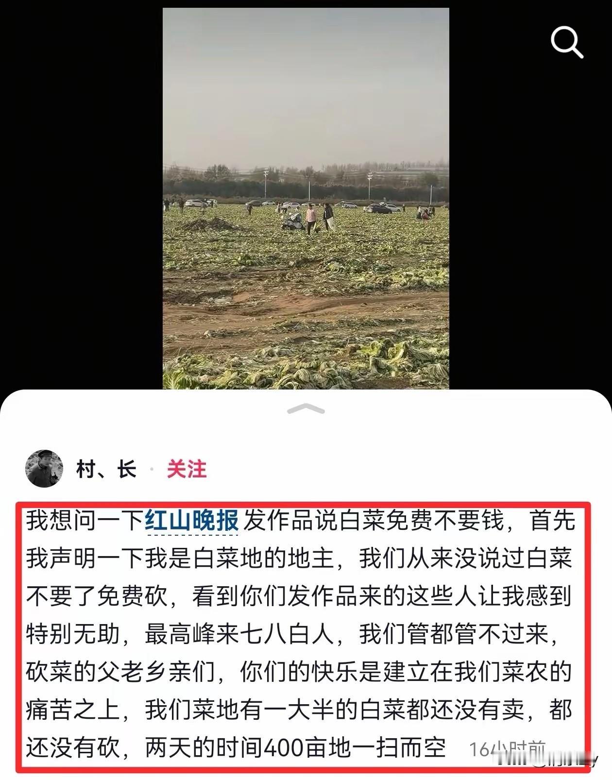近日,内蒙赤峰的一位种植大户,自己种植400亩白菜,两天内被一扫而空! 原因是当地某媒体转发的一段视频,说是免费捡土豆后又有新惊喜,赤峰一地可以免费砍白菜! 随着这条视频的发酵,来砍白菜的人越来越多,有人开着三轮车,有人开着轿车,最多的时候七八百人参与砍白菜!种植户急得哭起来,也管不过来这么多人! 很多游客也参与了其中,有人说砍白菜的过程中,孩子们很开心,收获满满!不想想你们的开心是建立在别人的痛苦之上! 种植户说,收白菜的车已经开到了地头,雇了八个人车还没装满四分之一白菜就被抢光了!他还说你们想带孩子来体验一下收获的快乐我能理解,可是我从来没有说过白菜不要了,免费砍啊! 400亩白菜可不是小数目,是种植户们辛辛苦苦劳作出来的成果,那些开着车去拉白菜的人你们有没有问过菜的主人?难道又跟抢土豆一样说法不责众吗?