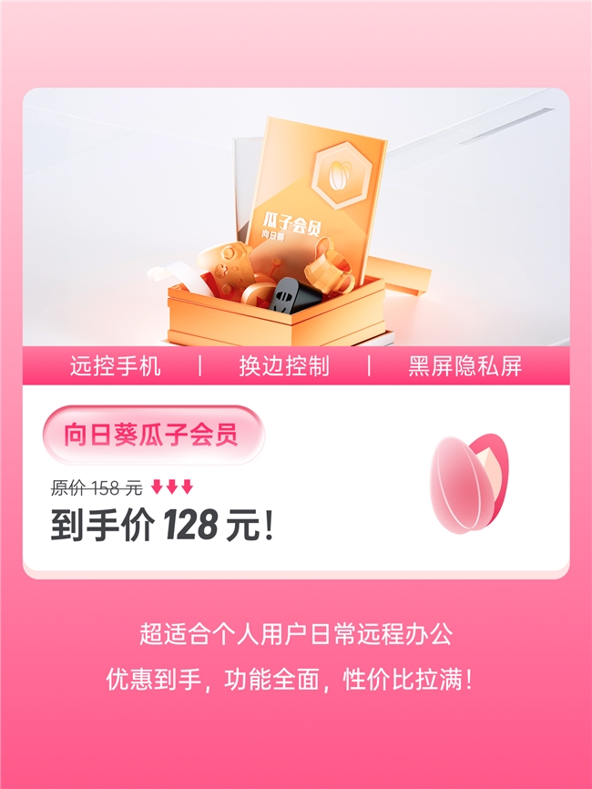 原价158元的瓜子会员,现在只要128元!享受全部会员特权,让远程操作体验全面升级。