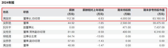 2024年年报显示,黄国荣年薪为112.38万元,吴新艳年薪为44.92万元。