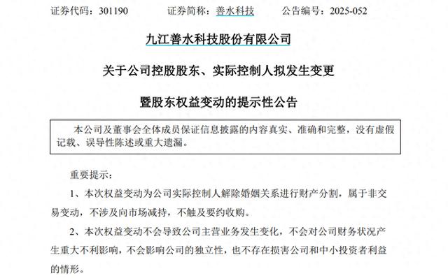 11月7日,善水科技发布公告称,公司实际控制人黄国荣和吴新艳解除婚姻关系,并进行财产分割,公司实控人变更为吴新艳。若按照善水科技11月7日的收盘价格计算,吴新艳新增持有的3790万股公司股票,市值达9.24亿元。