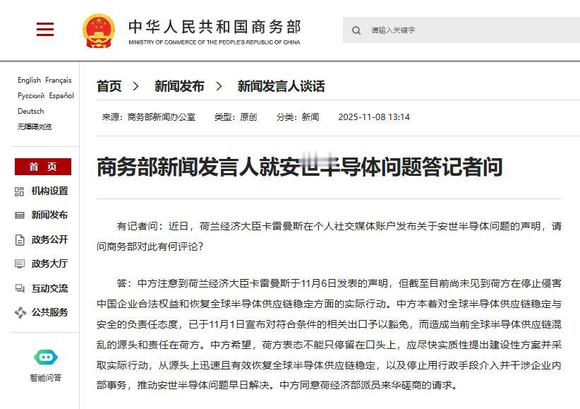 时隔近2月,荷兰最终认怂,称将归还安世控制权,中国:别光说不练! 之前强抢中国企业有多霸道,现在认怂就有多卑微。据《华尔街日报》报道,荷兰政府表示,将暂停对安世半导体的控制令,恢复中国股东的控制权。也就是说,几个月前被荷兰强抢的安世半导体,最终被他们自己乖乖吐了出来。曝荷兰将归还安世半导体控制权 面对荷兰的服软表态,中国商务部回应,荷兰方面的表态,不能光停留在口头上,需要实际行动。显然,中国这次一点儿面子没打算给荷兰留,这是要荷兰给荷兰上一堂深刻的“国际关系课”。 实际上,此前中方出于对全球半导体供应链稳定和安全的考虑,已经对欧洲车企“手下留情”了。从11月1日起,已经恢复国内安世半导体相关芯片向欧洲车企的出口,至少德国汽车零部件供应巨头奥摩维奥和博世都已经获得了来自中国的半导体产品。 荷兰彻底傻眼了,强抢安世本来就是想给中国一个“下马威”,逼迫中国服软,没想到中国直接不跟你谈判,相关的半导体产品直接绕过荷兰安世,这让荷兰这出强抢中国企业的行为成了彻底的“小丑行为”。 即使如今荷兰主动当着全球的面向中国服软,中国都一副爱搭不理的表情,荷兰应该已经想到了自己无数种悲惨下场。只不过中国最终还是给荷兰留了最后的机会。既然荷兰已经服软,要交还安世半导体,中方最终还是允许了荷兰经济部派人来中国磋商的请求。中方要传递的观点很明确:面对强抢中国企业的行为,在改正错误前绝不谈判。避免让其他国家认为这种强抢中国企业的行为是“可以谈”的。中方同意荷经济部派员来华磋商 如今,荷兰栽了这么大跟头,想好用什么来当赔礼了么?