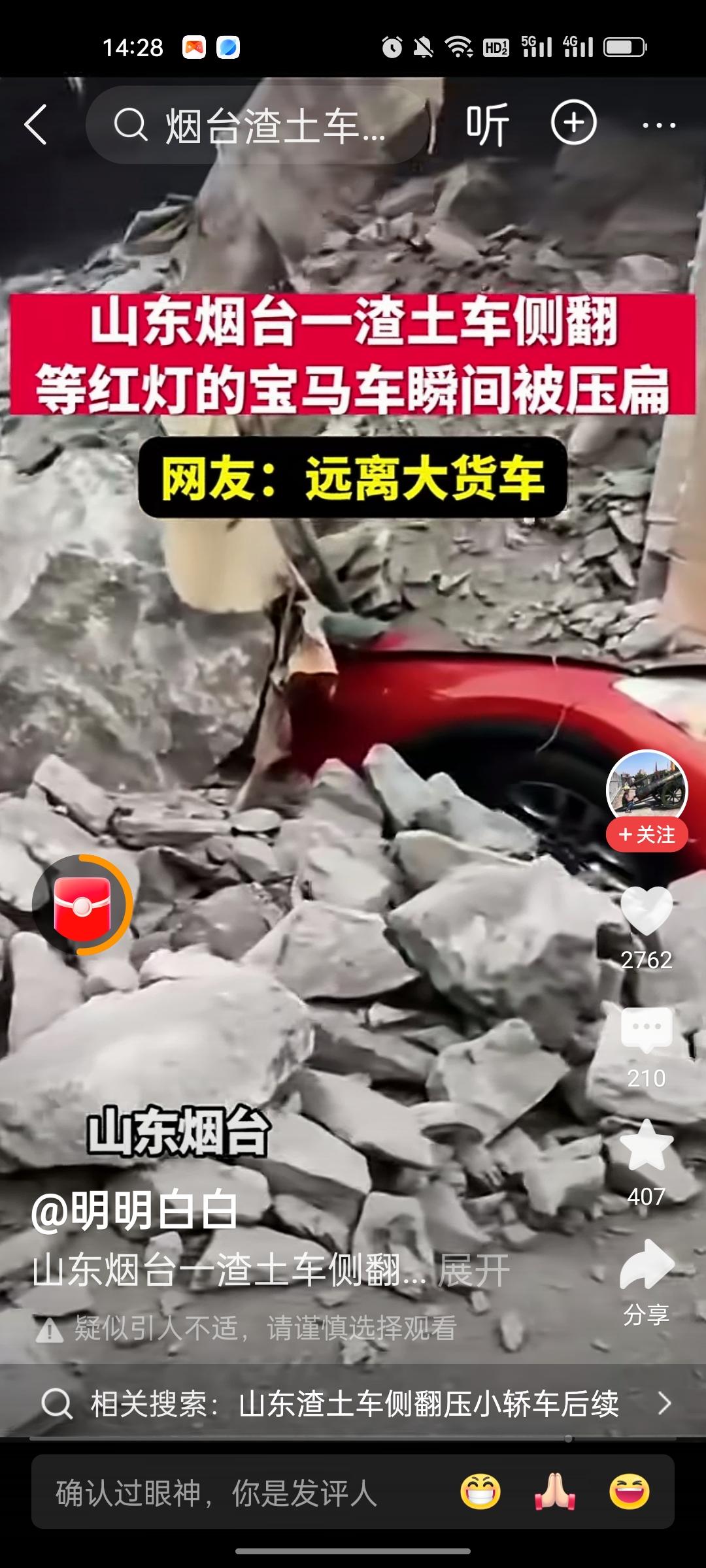 珍爱生命,远离大货车 昨天上午在烟台发电厂附近道路上,一辆拉渣土的大货车左转,不知什么缘故,突然发生侧翻。对面车道的红色宝马车当即被渣土砸中覆盖,眼看着宝马车司机生命堪忧。 其实这种大货车,超载、超速是常态,因为不这么做,就不赚钱。所以我上道的时候,看见这种车,都是躲得远远的。因为我有两个熟人就是开这种车的,据他们讲,没办法啊,不这么开,去哪儿挣钱? 远离大货保平安!