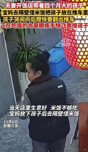 这是太大意了!安徽,四个月大的宝宝在婴儿车里扑腾哭闹,由于爸爸妈妈都在忙无暇顾及。在饭店吃饭的一男子看到宝宝即将坠落的瞬间,毫不犹豫直接飞奔过去接住了宝宝,当时为了救宝宝嘴巴都被摔破皮了,还拒绝免单。网友:你飞奔的样子真帅! 夫妻俩带着四个月大的宝宝开饭店,由于饭店很忙,女子去隔壁店借米饭了,想着没多久也就回来了,当时男子也在后厨忙着炒菜。就把宝宝留在大厅的婴儿车上,万万没想到宝宝看不到妈妈后,就一直在婴儿车上乱动。 头一个劲往婴儿车前边走,因为婴儿车前边就是空的,这样很容易翻车的。这一幕刚好被正在吃饭的大哥看到,就在宝宝即将掉来了的那一刻,他眼疾手快的跑去接住了宝宝。 因为婴儿车一旁就是啤酒,有点挡住大哥的路了,大哥也是着急救孩子,直接也摔倒了,但是他的手首先是扶住了孩子的头,还把嘴给磕破了。他不顾自己摔倒,而是一把先把孩子抱了起来,然后抱在怀里一直安抚宝宝。 我想这位好心大哥一定是做了父亲的人,不然他不会这样奋不顾身去救宝宝的。看他抱孩子的样子就很娴熟,女子回来后看到大哥抱着哄宝宝,心里很欣慰,因为也是一直来吃饭的老顾客吗。 女子得知是大哥救了宝宝,并且还受伤了,是从内心里非常愧疚的,也非常感谢他。就想为他免单,大哥是拒绝的,说这事谁看到以后也会帮忙的,本身你夫妻俩带着孩子开饭店也是不容易的。 男子一直在后厨忙着炒菜也没有当面感谢大哥,心中愧疚不已,也觉得很后怕。做生意固然重要,但是孩子的安全也更是重要的。危机时刻老顾客发现化身“闪电侠”将孩子光速接住,真的很暖人心。 对于这件事情,大家有什么看法? 信息来源:江北融媒