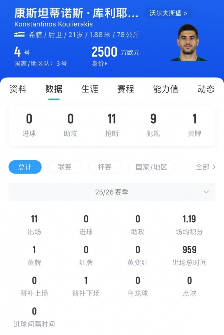 库利耶拉斯基现年21岁,是一名左脚中卫,他去年夏天加盟沃尔夫斯堡,本赛季已为球队出场11次,现身价2500万欧。