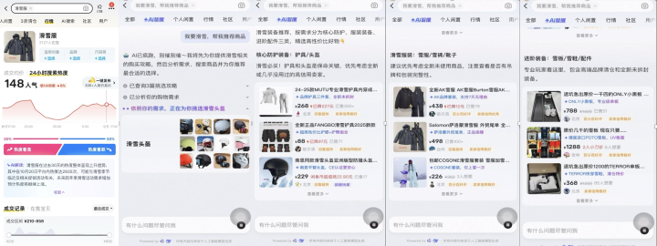 AI智搜以交互式搜索的方式深度理解用户需求,例如买家输入“滑雪必备商品”这类需求时,AI会先分析需求、结合用户购买偏好,再查询平台内这类商品行情价格,最终匹配符合要求的商品及卖家,同时提供详细的选购建议,大幅降低决策成本。据悉,从输入搜索需求到最终方案生成的过程最快10秒内就可以完成,AI智搜不仅可以“搜商品”,还可以满足用户“找攻略、找行情、找热点”等更多元的需求。