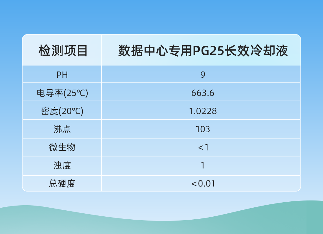 专业检测数据显示,统一智冷数据中心专用PG25长效冷却液的关键性能低电导特性、热稳定性、高纯净度等指标优异: