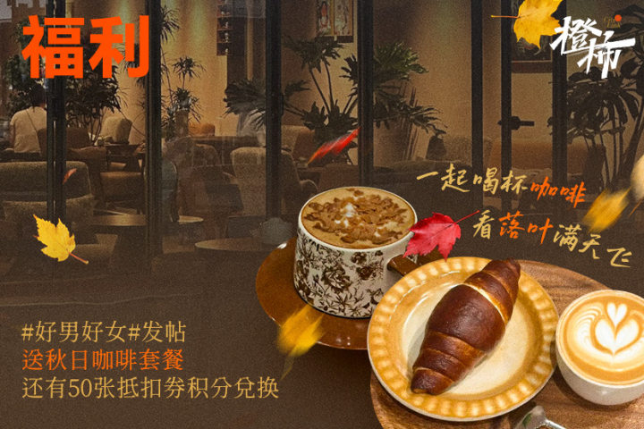 活动参与方式:在橙友圈#好男好女#话题下,带#秋冬咖啡日记#标签发帖,来发帖晒晒你在这个秋冬,打卡的咖啡馆,秋冬口味咖啡推荐,当然别忘了喊上你的咖啡搭子。