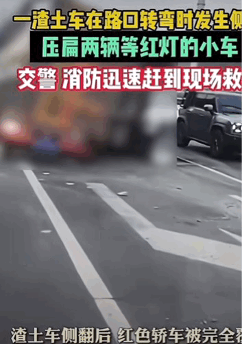 这完全是飞来横祸。11月7日,山东烟台。一辆渣土车在转弯时重心失控发生侧翻。满满的一车渣土压在了对向车道正在等红灯的一辆红色汽车和一辆灰色汽车上。 尤其是这辆红色汽车。整辆渣土车的重量几乎全压在了它身上。导致汽车严重的变形。 城市道路上都严格的限制了渣土车的通行,尤其是白天。不知道这辆渣土车是如何取得通行证上的路。这满满的一车渣土是否存在超重超速的问题,以至于在转弯时失控侧翻。在事发地后方不远处就立着一个交通警示标志,上面写着:宣传交通法规,提高文明意识。这时候显的是那么的苍白无力。