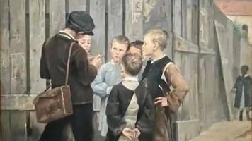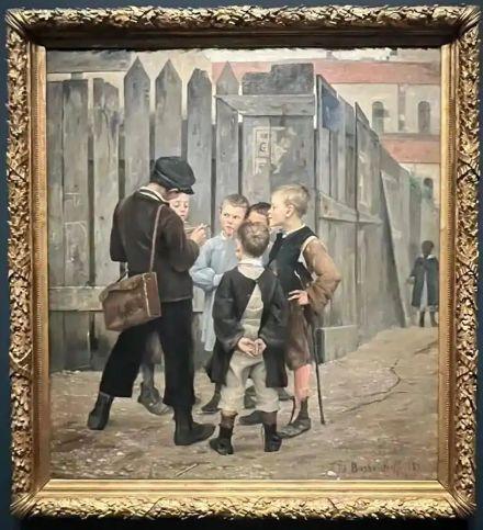 六个男孩,围在街头一道木栅栏前,似乎正谋划一出恶作剧。刚放学,他们灰色或黑色的罩衫,是校服。戴软边帽、背挎包的高个子男孩,背对我,手捏弹弓,大概是恶作剧的主导者。其余五个男孩,在听他说着什么,眼神恭顺或质疑。指甲缝里的黑屑,清晰可见。皮鞋上有泥痕或破洞。裤腿短到了小腿肚的位置,因他们生长得太快,父母无钱制新衣。木栅栏上,有刀子刻出的绞刑架痕迹、一抹绿漆、广告纸撕毁后残余的一角,传递出法国小镇十九世纪末的信息。