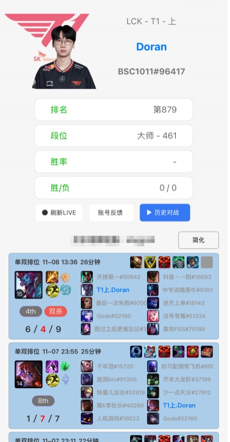 直播吧11月8日讯根据排位统计小程序显示Doran休赛期在峡谷之巅打Rank训练,但是选用的英雄打出的战绩欠佳。
