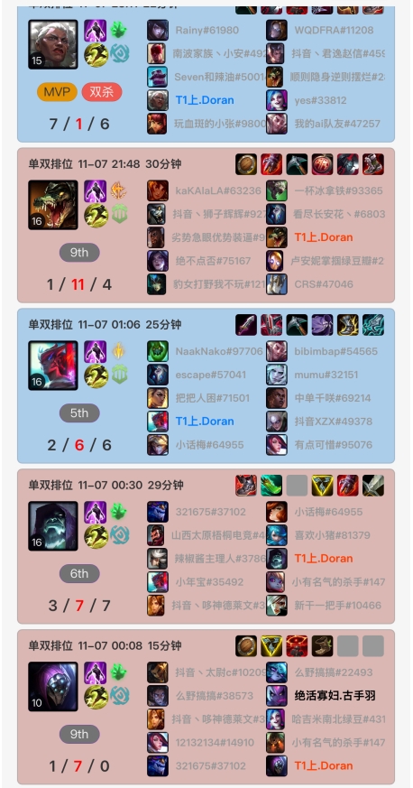 Doran近期峡谷之巅战绩:1-7的阿萝拉、1-11的鳄鱼、1-7的武器