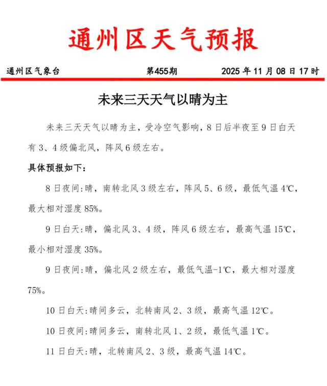 今天(8日)夜间:晴,南转北风3级左右,阵风5、6级,最低气温4℃。