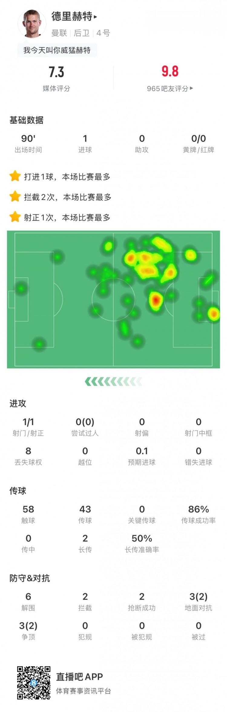 直播吧11月8日讯英超第11轮,曼联客场2-2绝平热刺,德里赫特在伤停补时读秒阶段头球破门,帮助球队从客场带走1分。