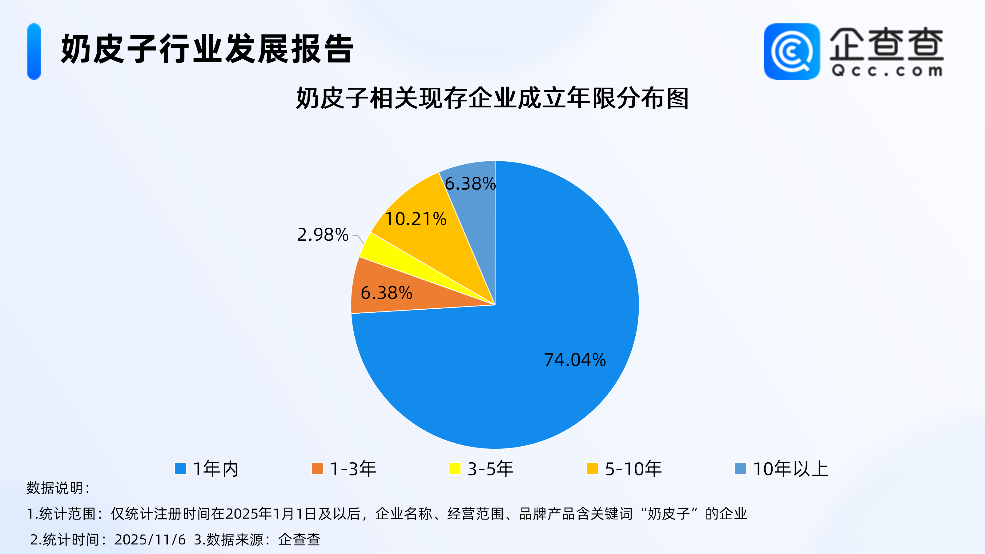 企查查数据显示,截至11月6日,国内奶皮子相关企业现存量达235家,超7成相关企业成立于1年内,占比达74.04%。其次为成立年限在5-10年的相关企业,占比达10.21%。