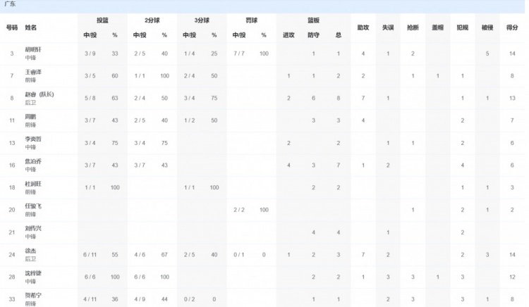 广东队方面,徐杰14分3篮板7助攻,赵睿13分8篮板7助攻,胡明轩14分1篮板4助攻,沈梓捷12分2篮板1助攻3抢断1盖帽。