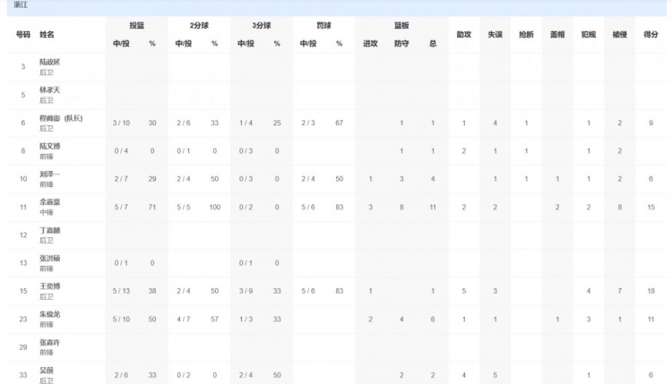 浙江队方面,余嘉豪15分11篮板2助攻2盖帽,王奕博18分1篮板5助攻,朱俊龙11分6篮板1助攻1盖帽,吴前6分2篮板4助攻。