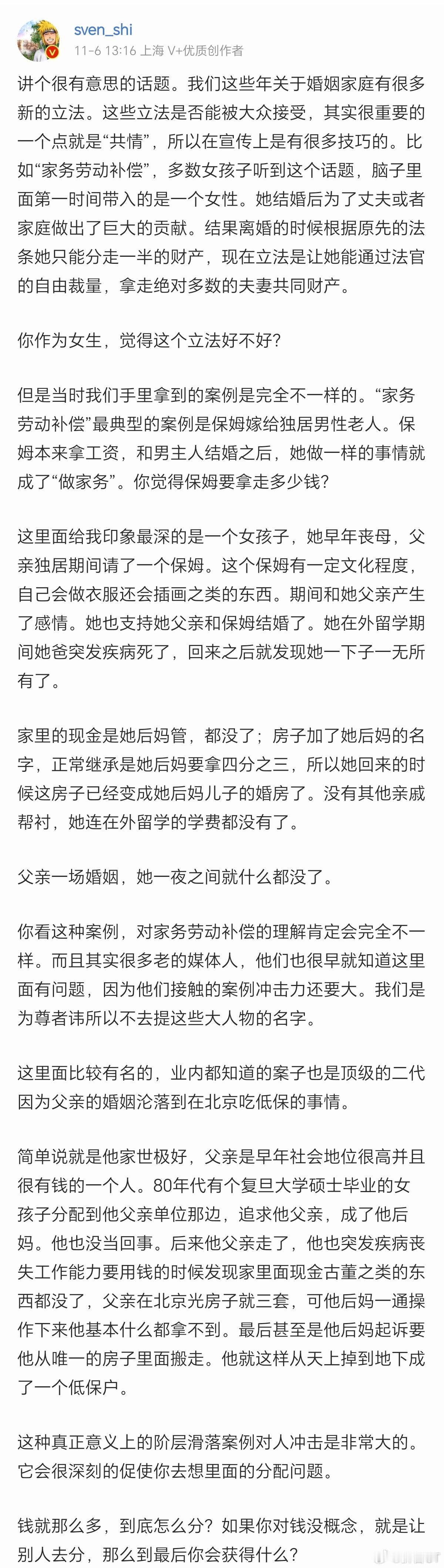 斯文前两天就讲过这个话题,当时是以家务补偿作为切入口。