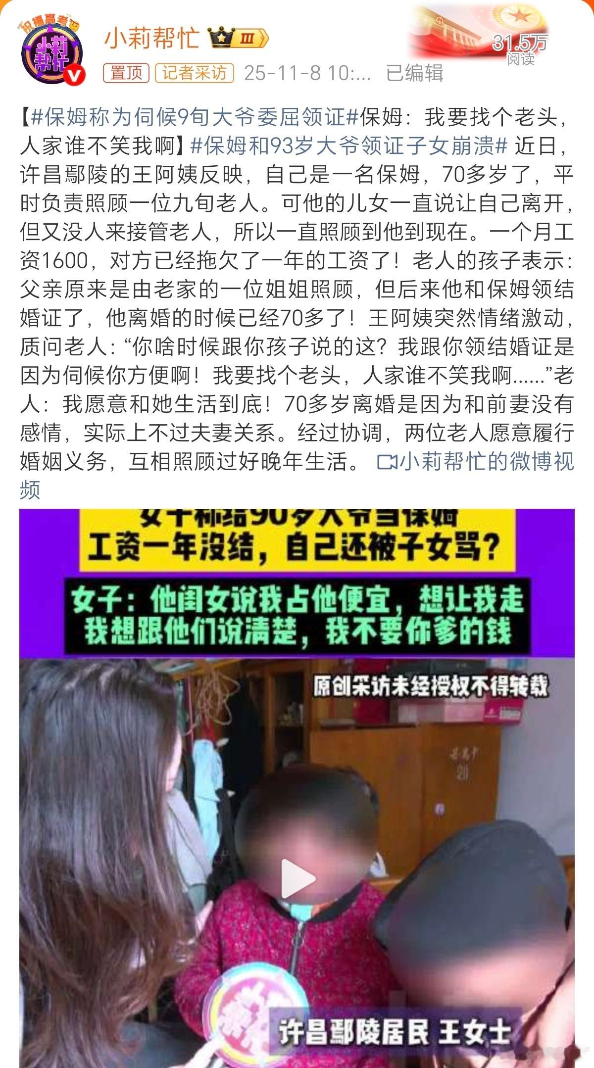 保姆称为伺候9旬大爷委屈领证