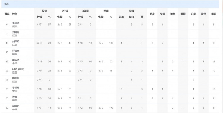 江苏队方面,蒋浩然22分3篮板3抢断1盖帽,李禄曈10分3篮板1助攻,闫实10分2篮板4助攻。