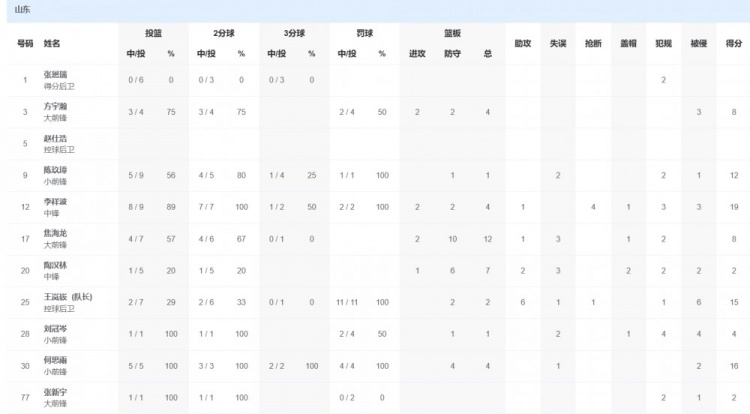 山东队方面,李祥波19分4篮板1助攻4抢断1盖帽,何思雨16分4篮板,王岚嵚15分2篮板6助攻1抢断,陶汉林2分7篮板2助攻2盖帽。