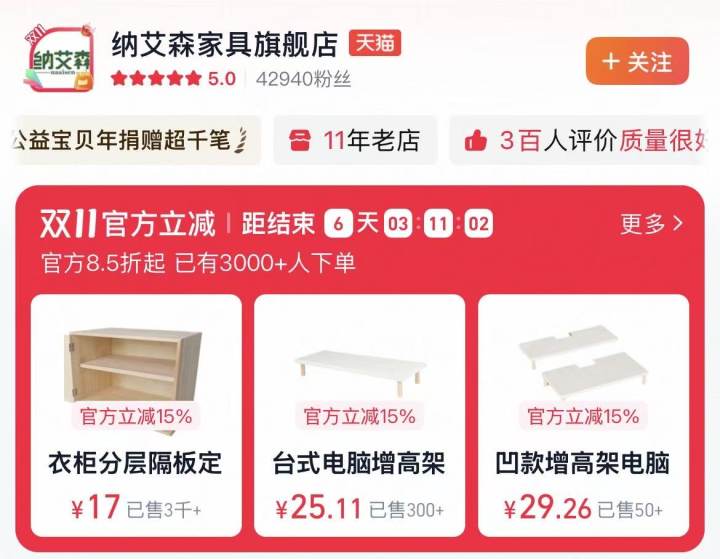 纳艾森家具是天猫一家开了11年的老店,店铺总分超过了99%同行。