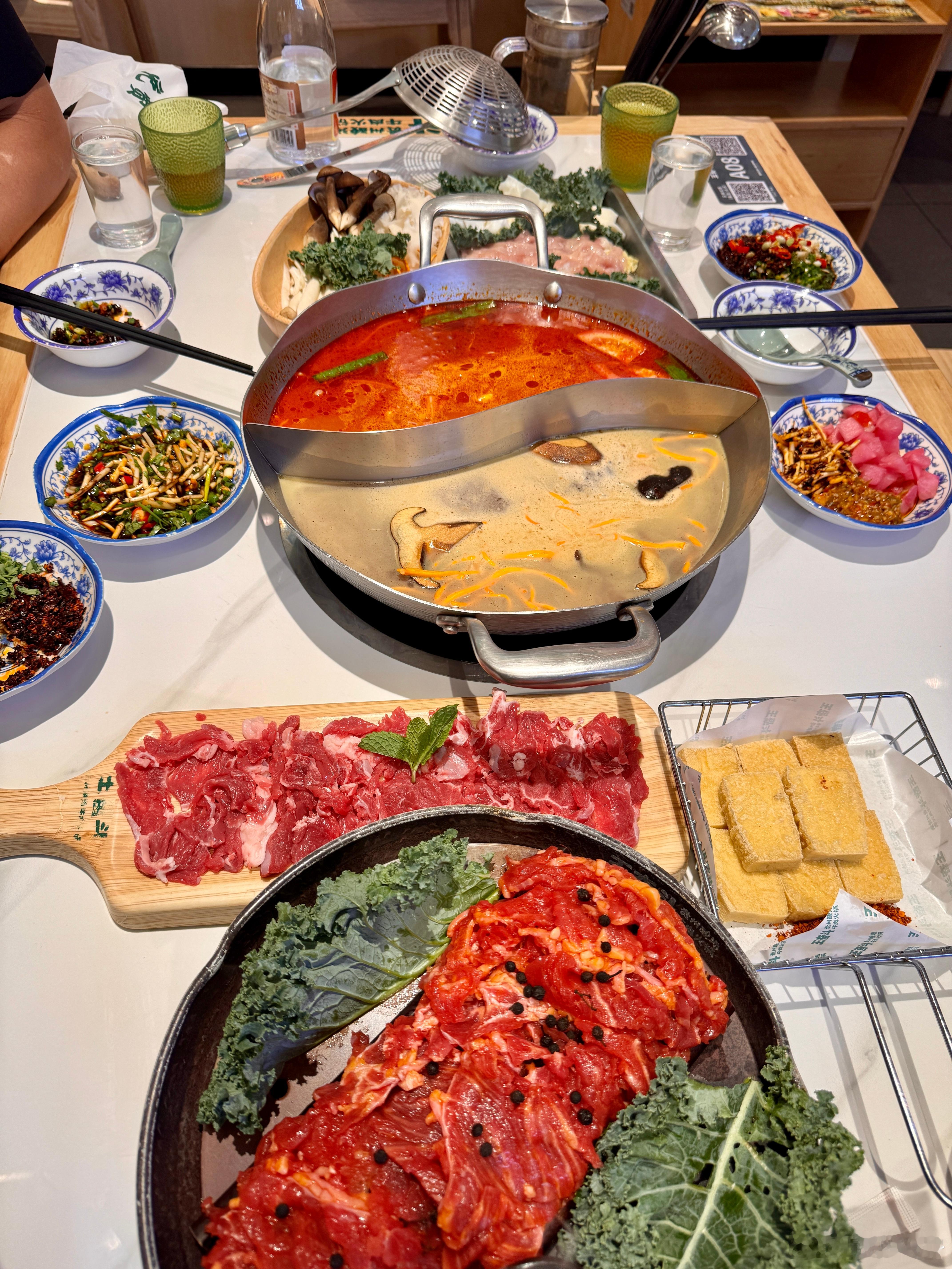 🍲这天一冷了,火锅必须安排上,领上神券果断冲种草了很久的贵州酸汤火锅。酸酸辣辣浓浓的木姜子味道,特别适合冬天,暖暖的还不油腻。鲜切牛肉,文昌嫩鸡,各种菌菇蔬菜山野菜都特别适合火锅。带折耳根的料汁更是封神!鲜辣好吃😋