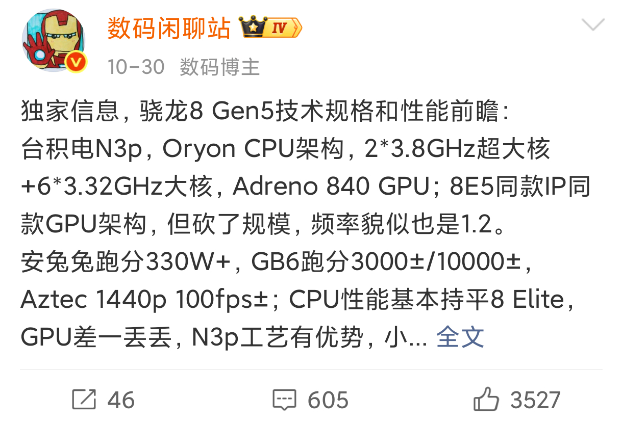 骁龙8 Gen5命名和性能参数已经首发揭露过了,芯片暂定11月底发布,首批新机有