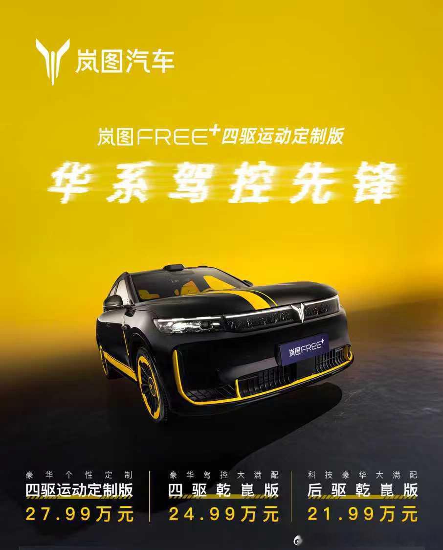 目前岚图FREE+有三款在售车型,分别为指导价21.99万元的后驱乾崑版,指导价24.99万元的四驱乾崑版,以及刚刚上市指导价27.99万元的四驱运动定制版。