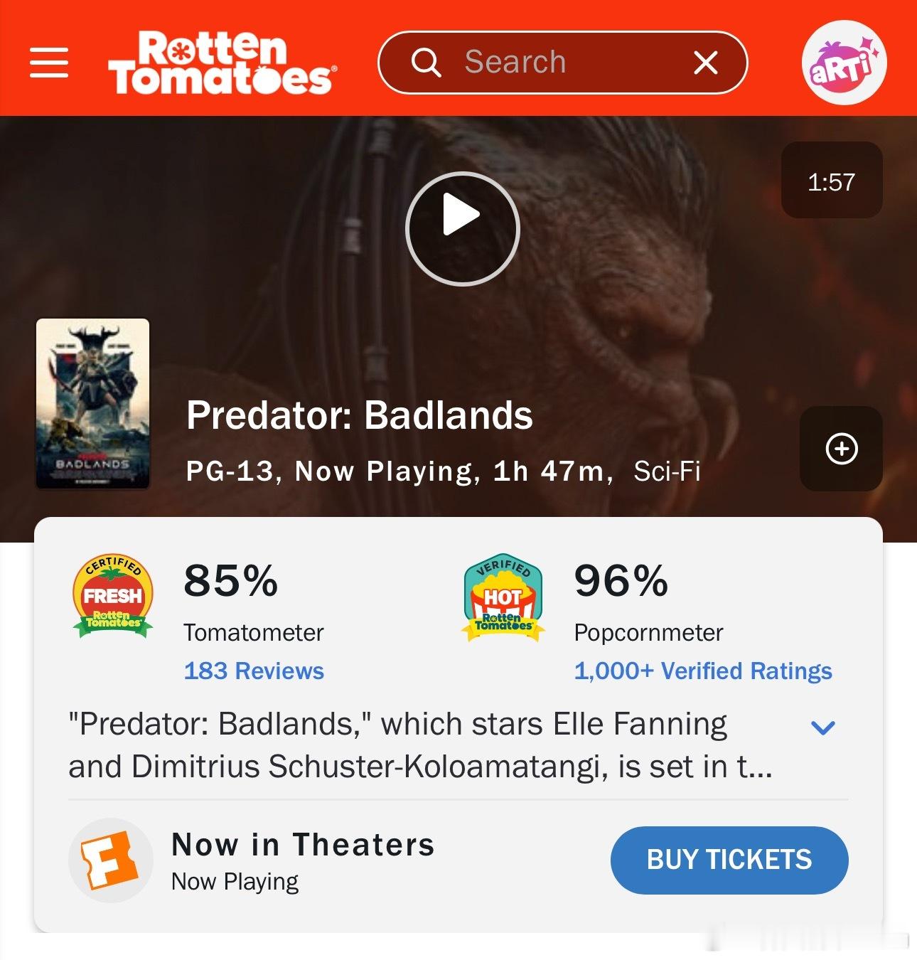 本周末在内地上映的《铁血战士:杀戮之地》烂番茄上媒体的新鲜度85%,观众评分的爆米花指数高达96%,爆米花指数在今年大范围上映的商业片中仅次于《链锯人 剧场版:蕾塞篇》