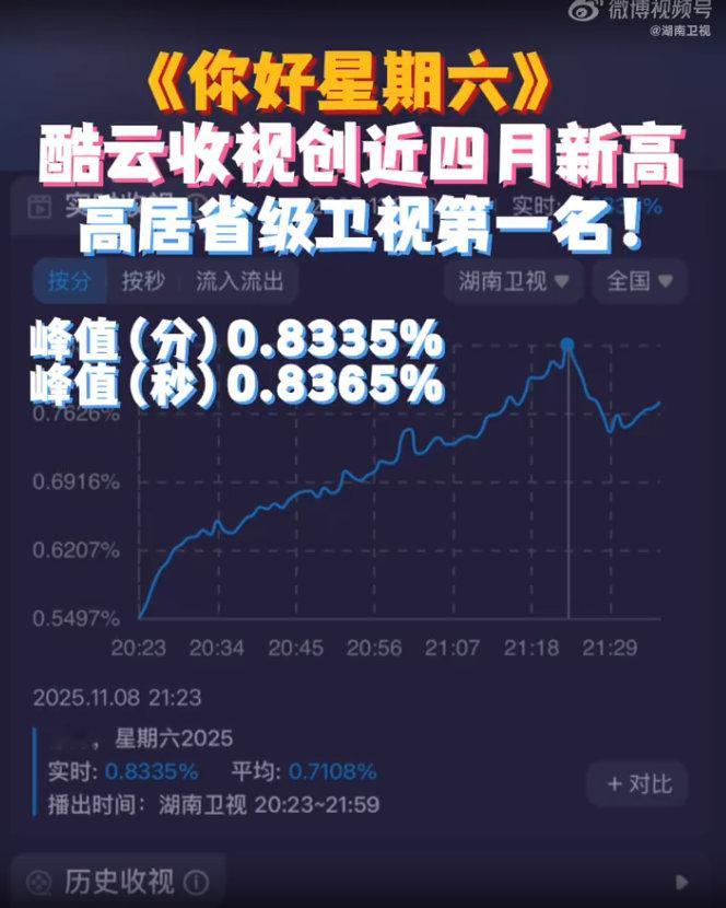 hi6收视创近四月新高 你好星期六 《你好星期六》好六时装周今晚惊艳亮相,酷云实时收视峰值达0.8365%,创近四月新高,省级卫视收视王者!