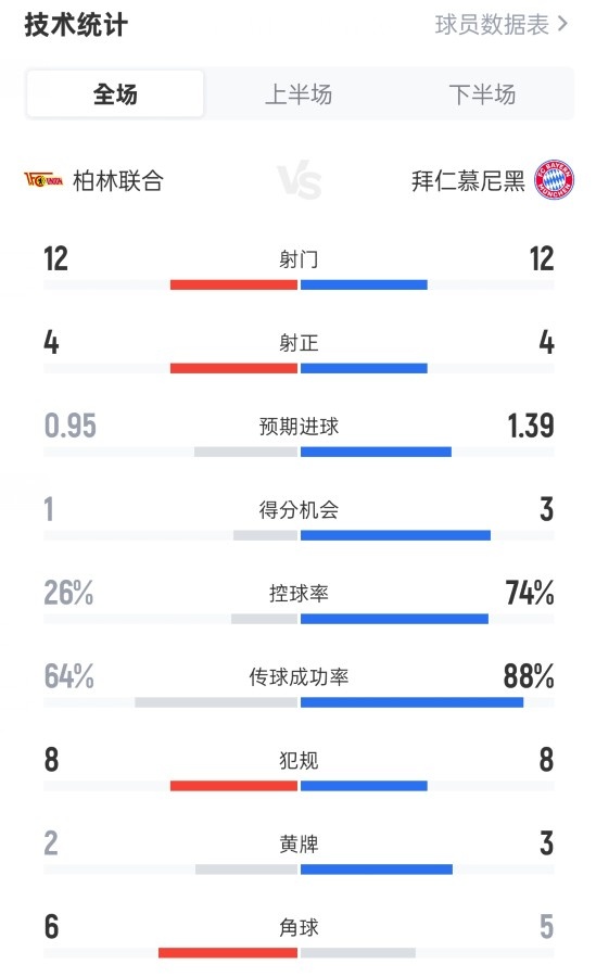 柏林联合2-2拜仁全场数据:射门12-12,射正4-4,控球率26%-74%