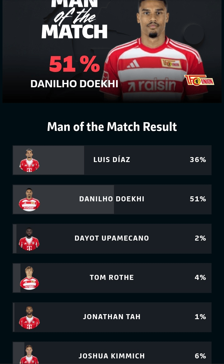 梅开二度,多克希当选柏林联合vs拜仁全场最佳球员