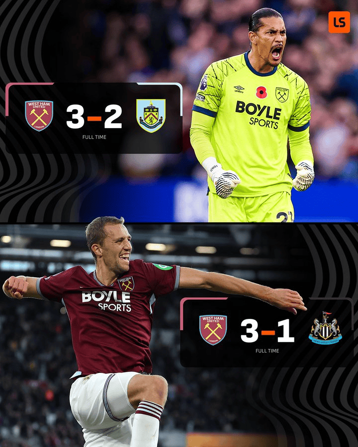 在上轮比赛中,西汉姆联也以3-1战胜了纽卡斯尔,这是铁锤帮自2月以来首次连续赢得两场英超比赛。
