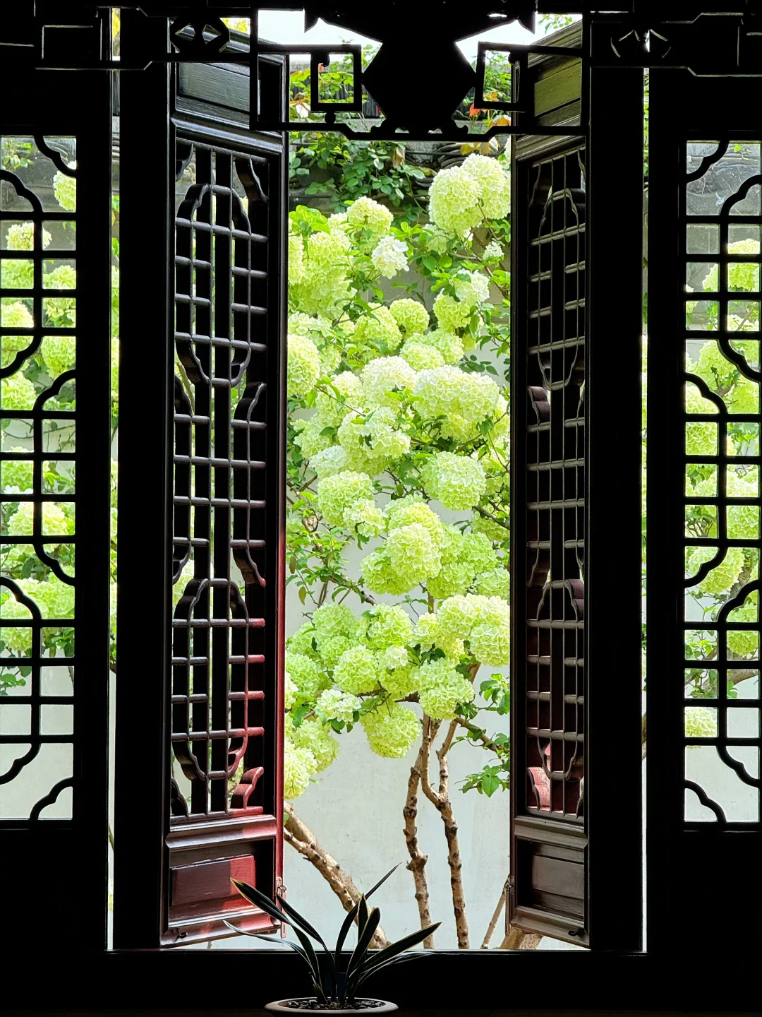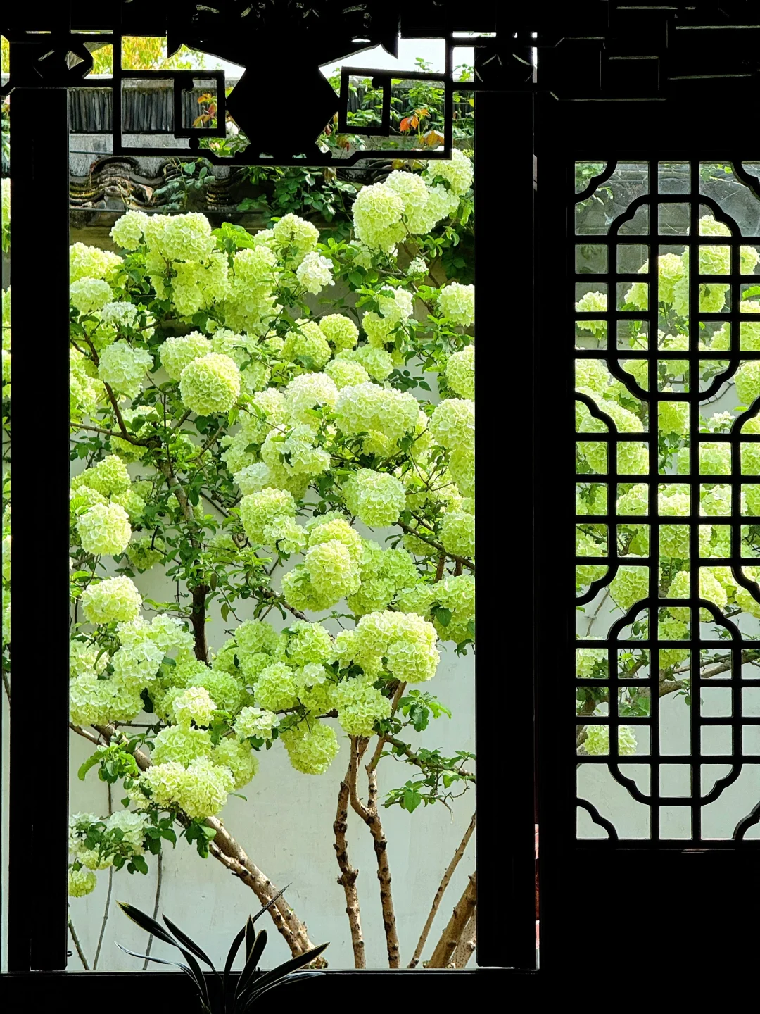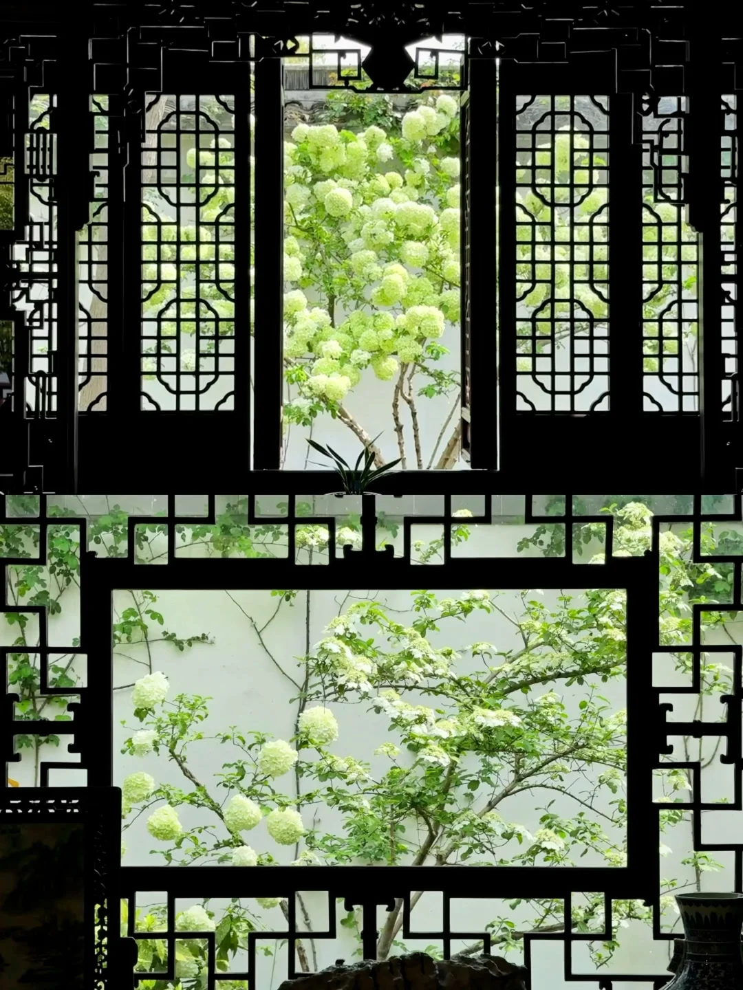 在苏州的园林深处🏯 一扇镂空雕花的传统花窗🪟 悄然框住春日🌿的私语 木绣球🌳枝桠斜倚 如雪团❄️簇拥的繁花缀满枝头🌿 初绽时绿意💚含羞 盛放时皎若云絮☁️ 与窗棂上🪟的雅致线条相映成趣✨ 风过时,花球微颤,光影在窗间流转💫 恰似古人笔下📜 “团雪高抛去,冻在枝头春不知”的意境🌿 令方寸之窗自成天地🖼️ 一树一景皆成诗~ . 📍苏州可园【濯缨处】 📸2025.04.09 .