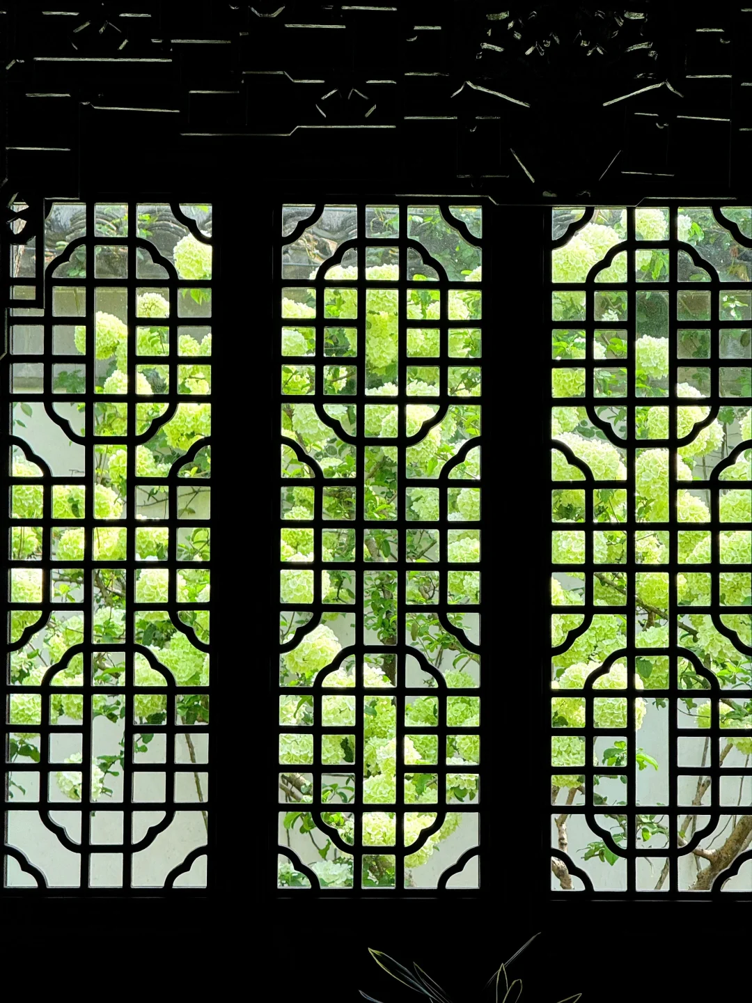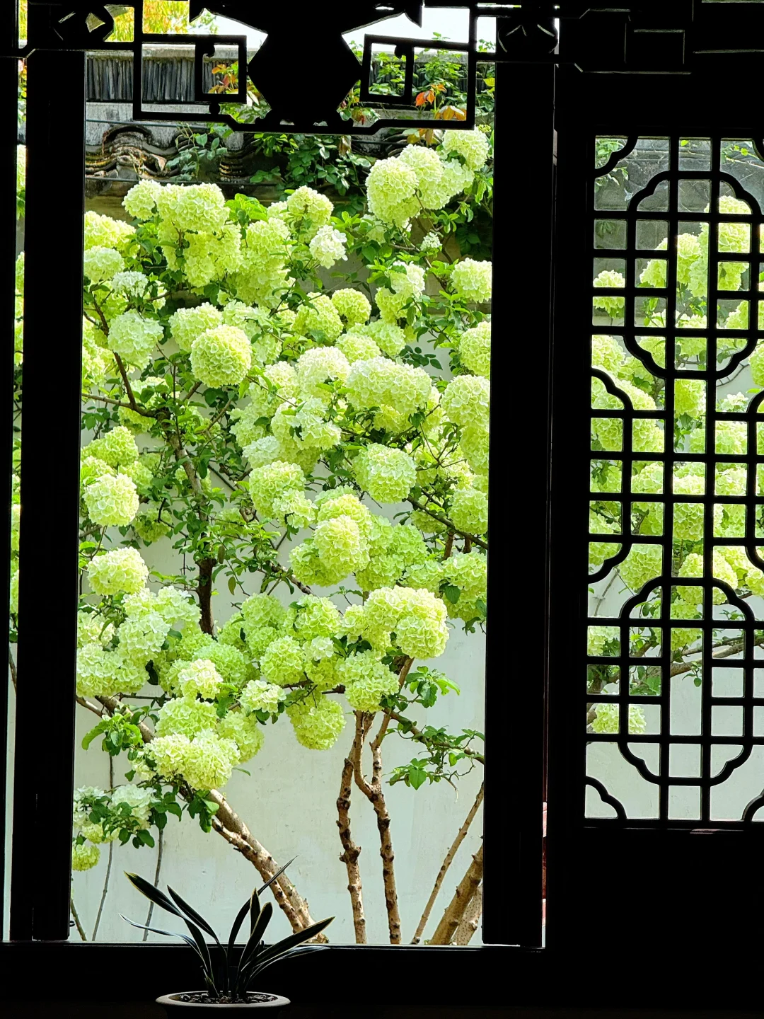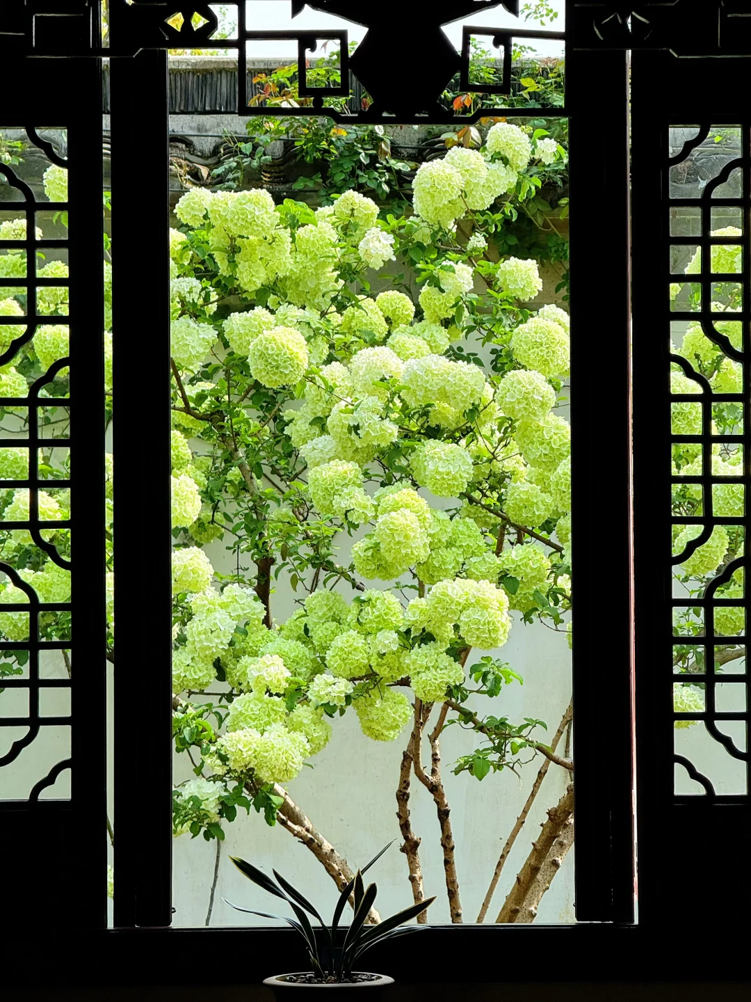 在苏州的园林深处🏯 一扇镂空雕花的传统花窗🪟 悄然框住春日🌿的私语 木绣球🌳枝桠斜倚 如雪团❄️簇拥的繁花缀满枝头🌿 初绽时绿意💚含羞 盛放时皎若云絮☁️ 与窗棂上🪟的雅致线条相映成趣✨ 风过时,花球微颤,光影在窗间流转💫 恰似古人笔下📜 “团雪高抛去,冻在枝头春不知”的意境🌿 令方寸之窗自成天地🖼️ 一树一景皆成诗~ . 📍苏州可园【濯缨处】 📸2025.04.09 .