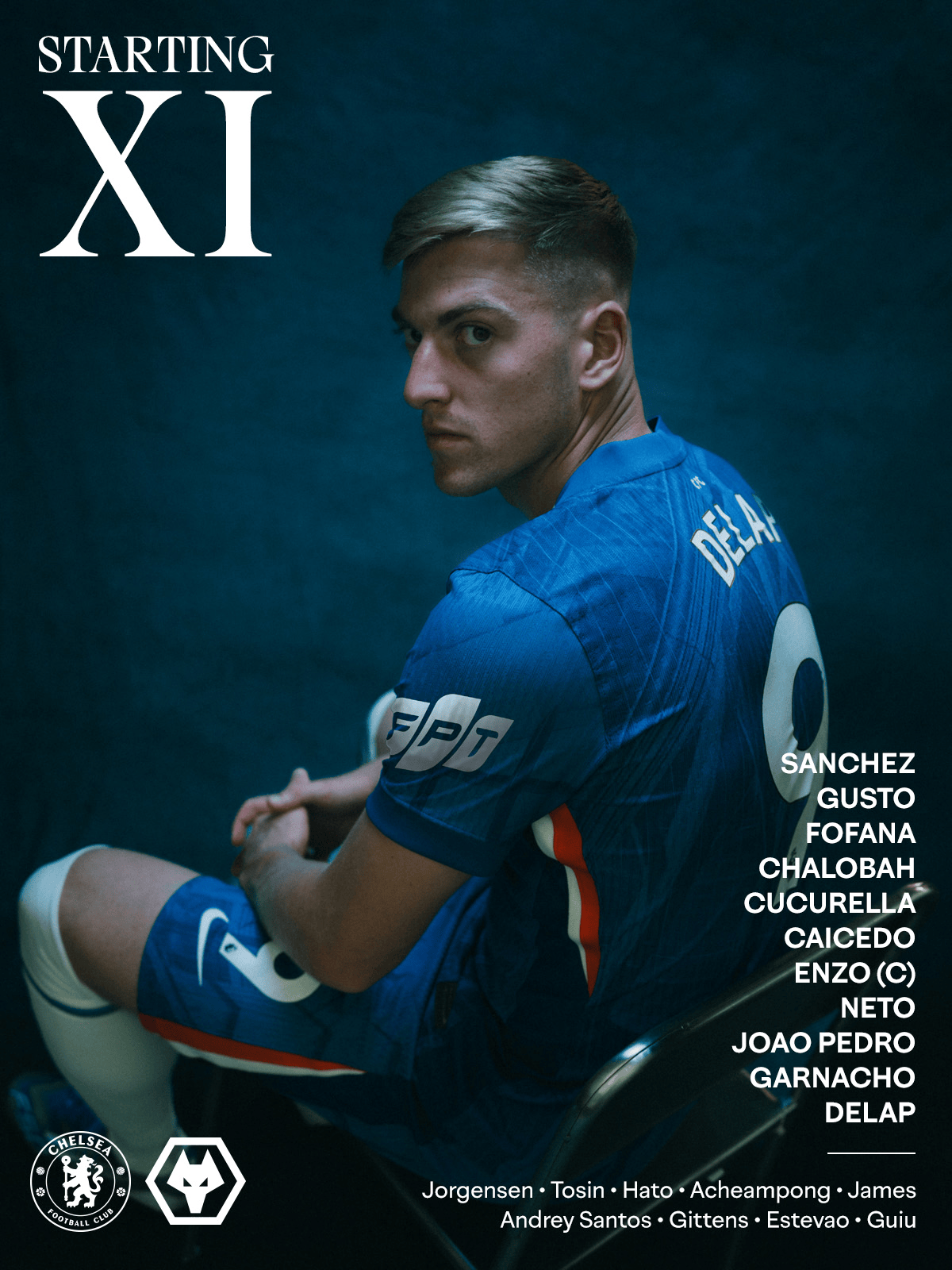 切尔西首发:1-罗伯特-桑切斯、27-古斯托、29-韦斯利-福法纳、23-查洛巴、3-库库雷利亚、25-凯塞多、8-恩佐-费尔南德斯、7-佩德罗-内托、20-若昂-佩德罗、49-加纳乔、9-德拉普