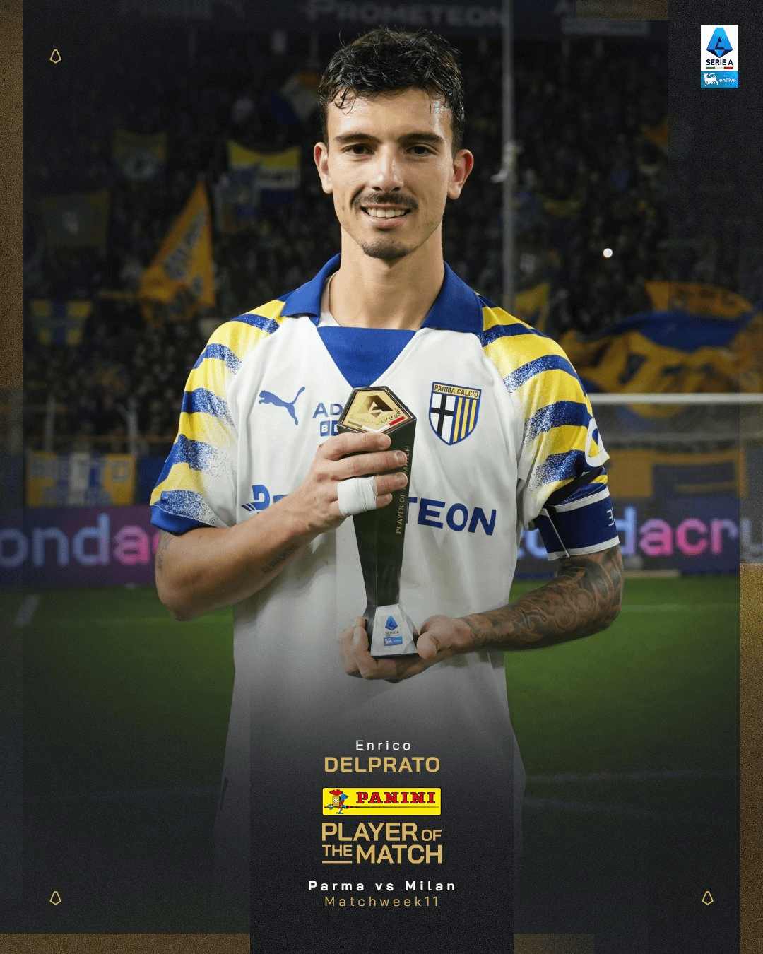扳平比分,德尔普拉托当选帕尔马vs米兰全场最佳球员