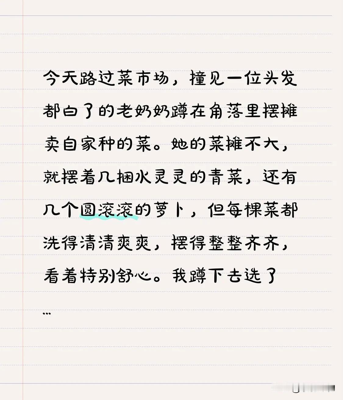 今天路过菜市场,撞见一位头发都白了的老奶奶蹲在角落里摆摊卖自家种的菜。她的菜摊不大,就摆着几捆水灵灵的青菜,还有几个圆滚滚的萝卜,但每棵菜都洗得清清爽爽,摆得整整齐齐,看着特别舒心。 我蹲下去选了一把青菜,老奶奶笑眯眯地开口:"这都是我自己种的,没用化肥。"她那双手粗糙得像老树皮,指缝里还沾着新鲜的泥土,一看就是常干活的人。我忍不住问她:这么大年纪了,怎么还出来摆摊呀?她摆了摆手,笑着说:"在家待着也是待着,能多赚点零花钱就多赚点。" 付账的时候,我想着多给五块钱,她却非要找零,坚持要把多的钱还给我。"该多少就是多少,我不能占你便宜。"她摆摆手,认真地说。那一刻,我心里突然有点触动:这些实实在在的老人们,才是我们真正该追的"榜样"。 现在的年轻人,总忙着追网红、追星,却很少留意身边那些靠自己双手创造价值的普通人。他们可能不会直播带货,也不会拍短视频,但他们用最踏实的行动,告诉我们什么是真正的尊严。你身边有没有这样让人心里一暖的普通人呢? 摆摊卖菜老人 卖菜的小贩 卖菜老太 街边卖菜 集市卖菜 卖菜老太太 种菜卖菜老人
