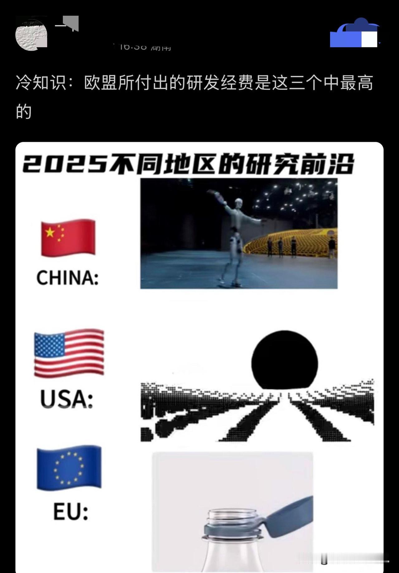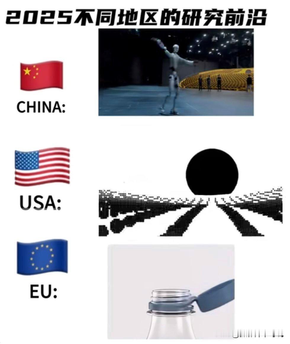 有没有能看懂这张图的?第一个大概看懂了,第三个好像看懂了又好像没看懂,至于第二个是完全没看懂。今天看到一网友发的“2025年不同地区研究前沿”的图片,应该是网友按照自己的理解制作的一张总结图。第一个说的是机器人,第三个貌似是说这里的人完全点歪了科技树,亦或者是极端环保?至于第二个嘛,就是一个黑白的太阳,具体是什么完全猜不透。有没有老铁能猜出来?