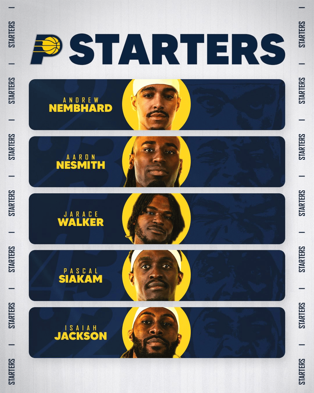 赛前,步行者官方晒出本场比赛球队首发阵容:安德鲁-内姆布哈德、阿龙-内史密斯、贾拉斯-沃克、帕斯卡尔-西亚卡姆和以赛亚-杰克逊。