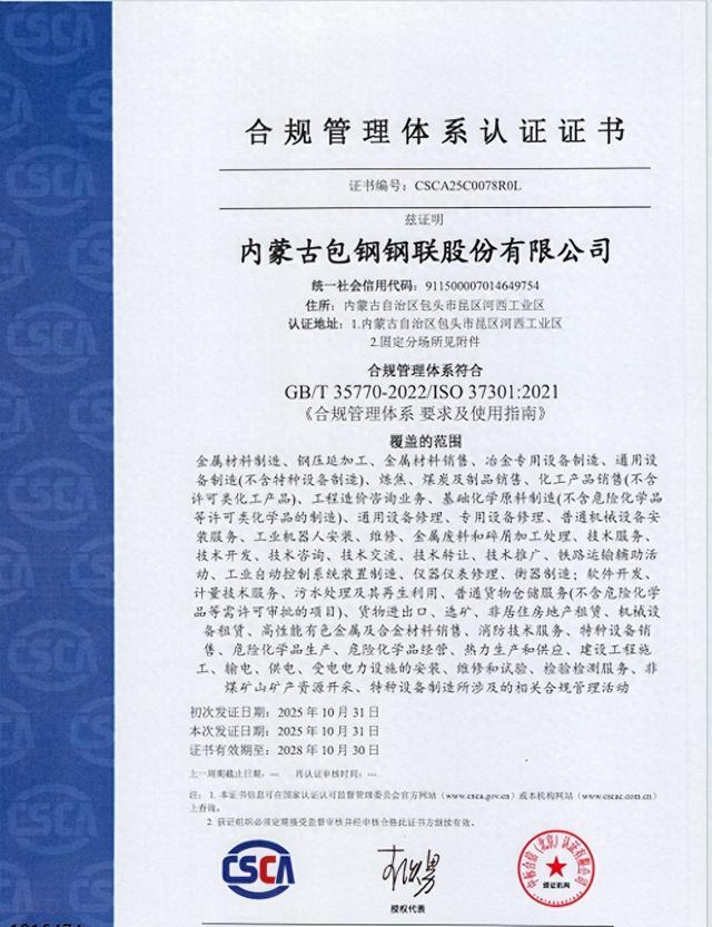 此次获得双标认证,不仅为包钢股份拓展国内外市场提供了权威“合规通行证”,也进一步彰显了企业以合规建设赋能高质量发展的坚定决心。包钢股份将持续深化合规与业务运营深度融合,依托稀土钢优势,加快推进高端化、绿色化转型,夯实上市公司规范治理根基,高标准完善合规体系、坚守经营底线,全力打造世界一流钢铁企业,为服务国家战略、助力区域经济发展提供有力支撑。